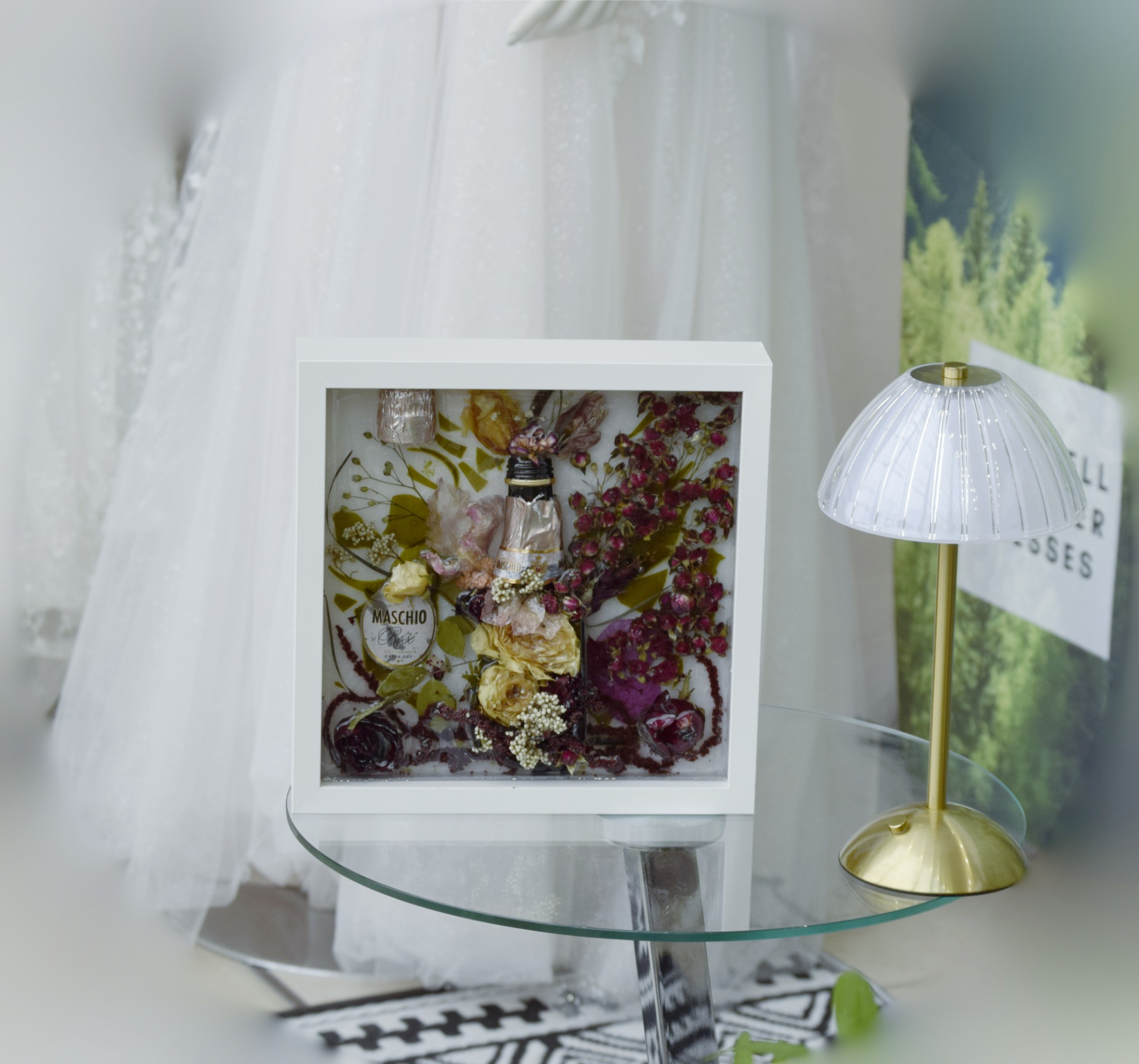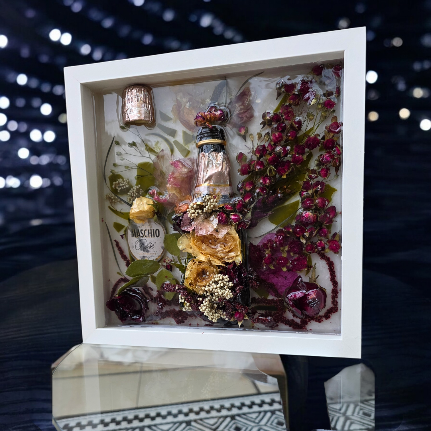 Each fragment is carefully arranged and encased in crystal-clear resin within a deep white shadow frame, creating a timeless keepsake that symbolises joy, milestones, and fleeting moments made permanent. The preserved flowers appear to float around the shattered bottle, telling a story of celebration, love, and memory.