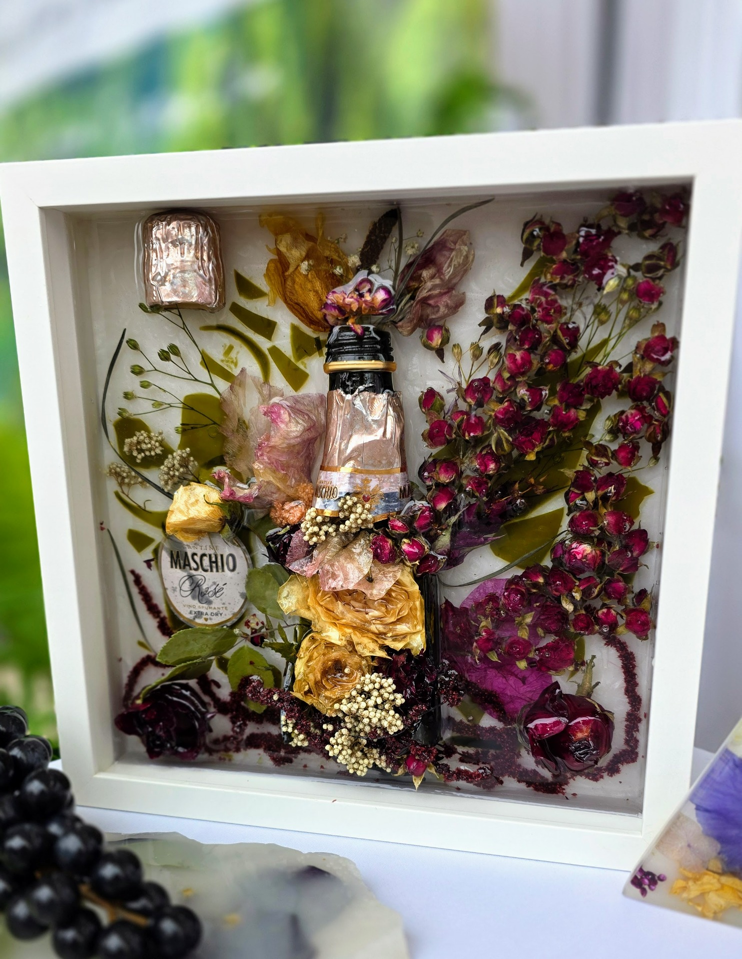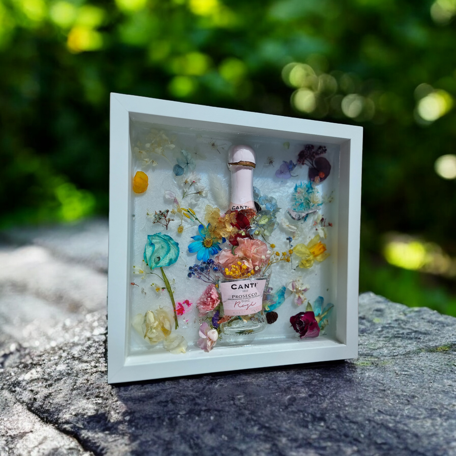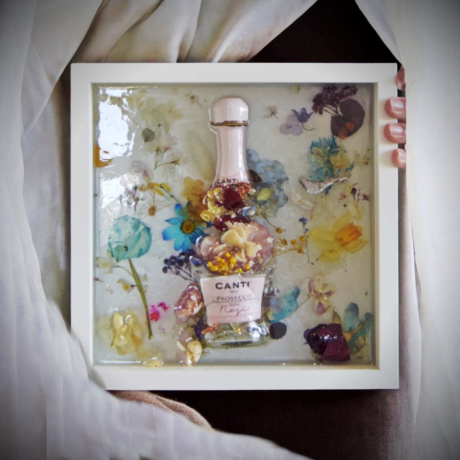 This one-of-a-kind resin artwork captures the beauty found after celebration — a broken prosecco bottle, delicately preserved among real dried flowers and botanicals.