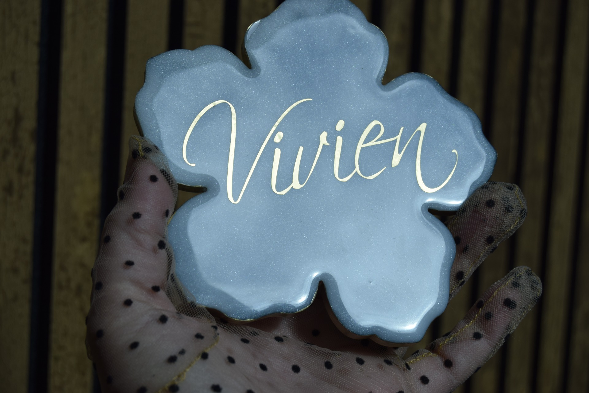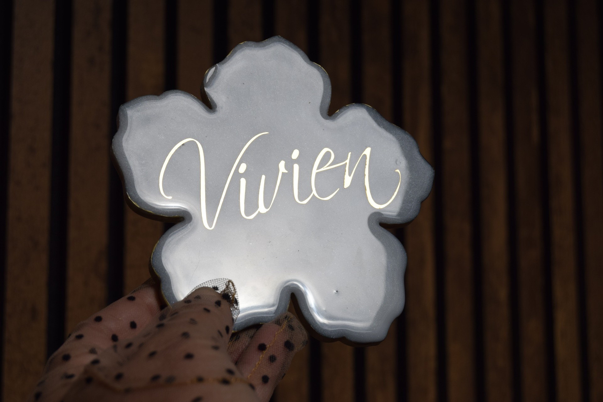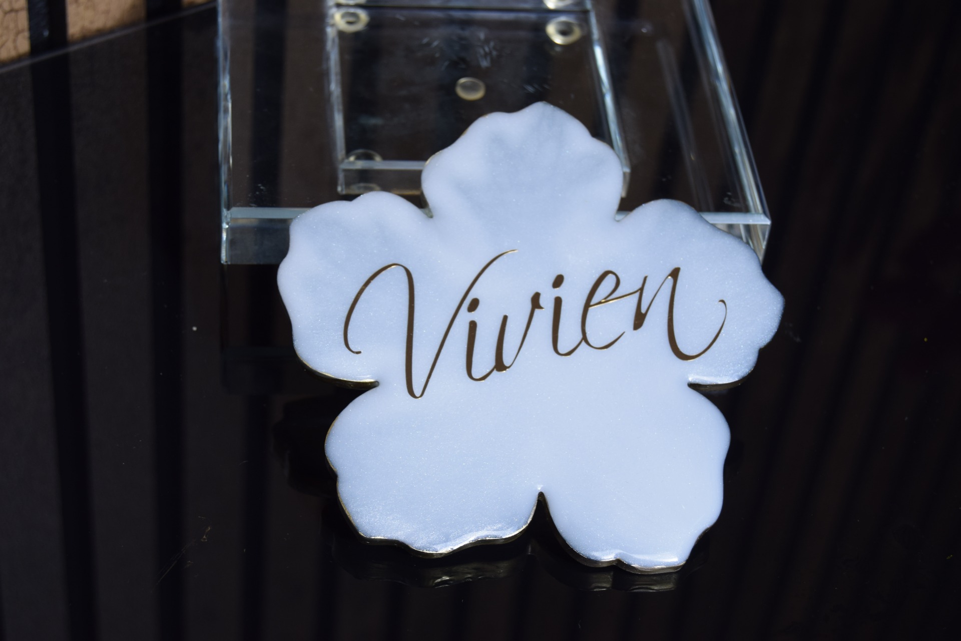 Beautiful flower-shaped coaster, personalised with name or word (date) of your choice. A lovely keepsake for weddings, bridal showers, or special events.