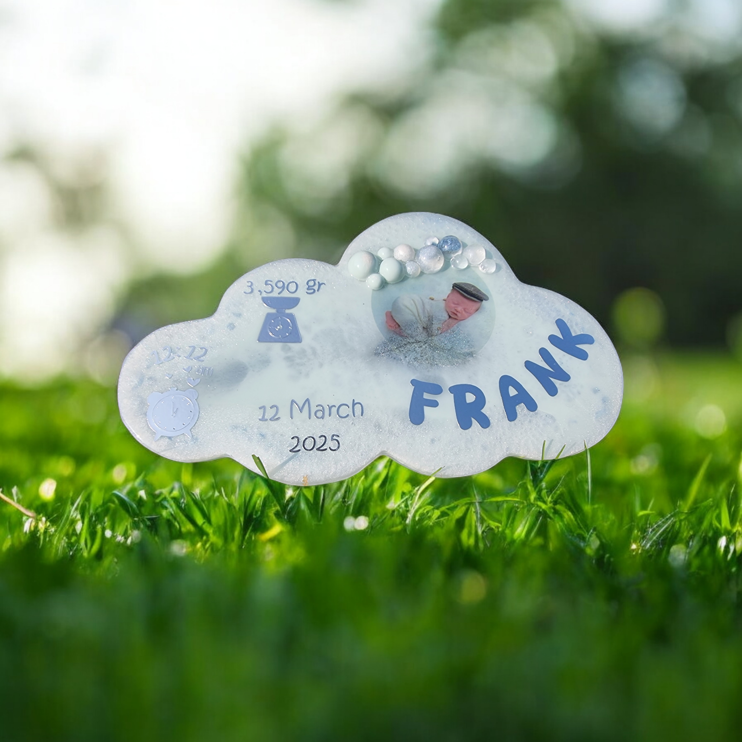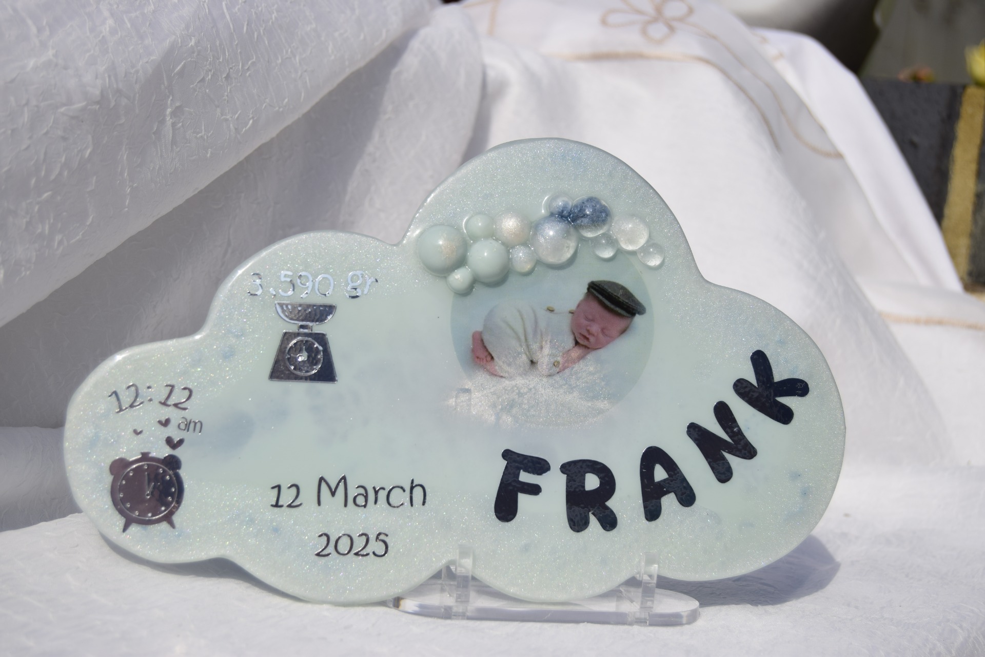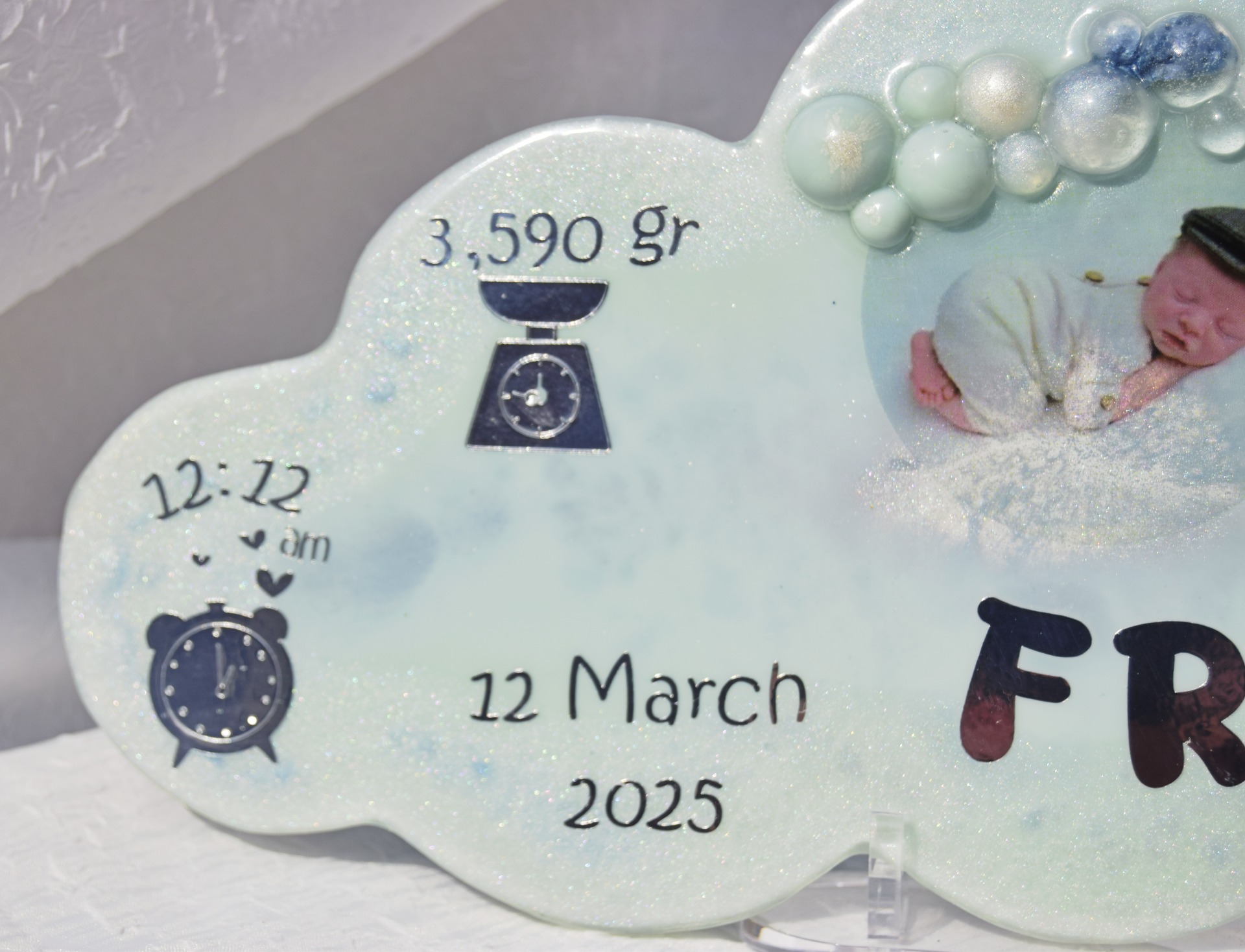 Personalised baby keepsake cloud, handmade from high-quality epoxy resin and customised with your newborn’s birth details. This unique resin plaque is designed to preserve precious memories from your baby’s first moments.