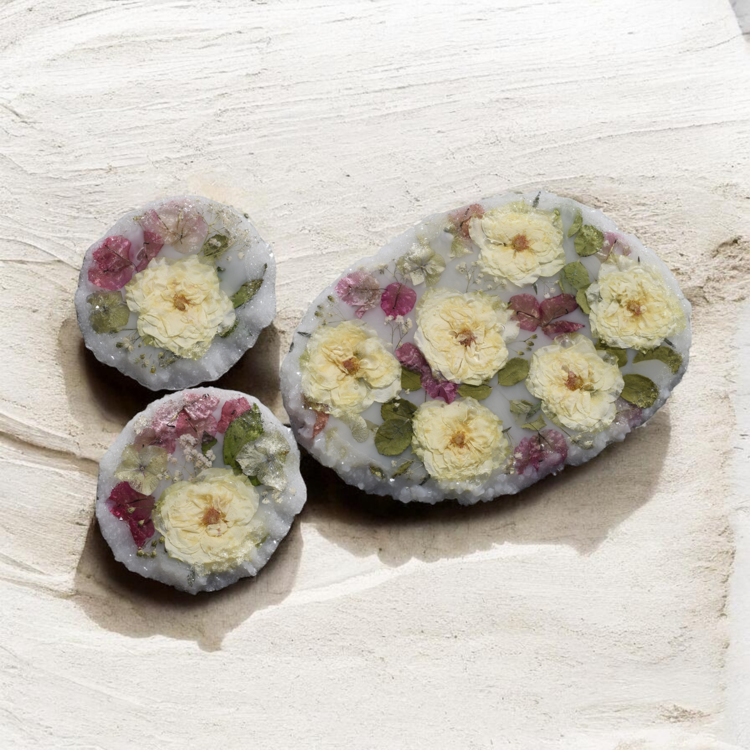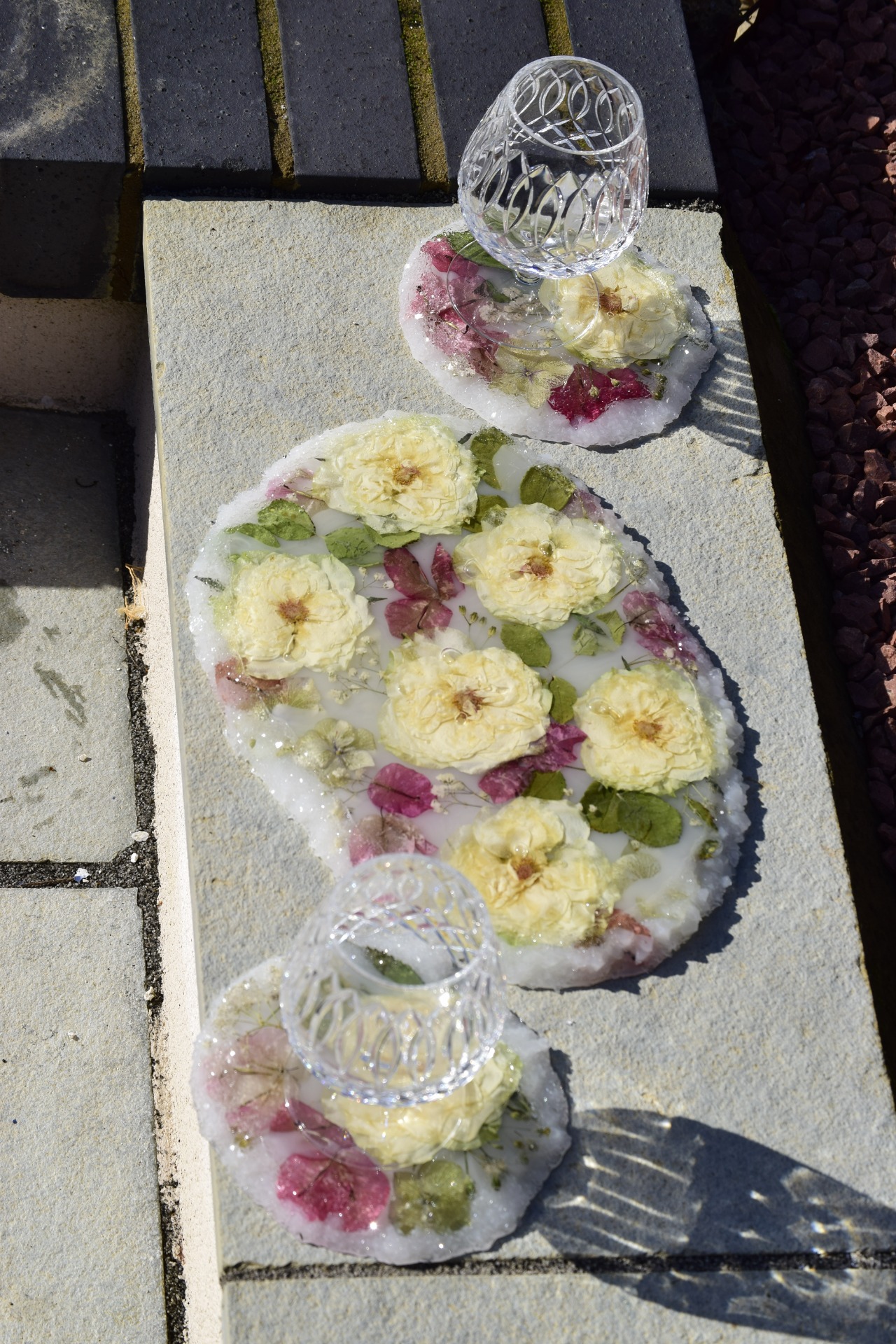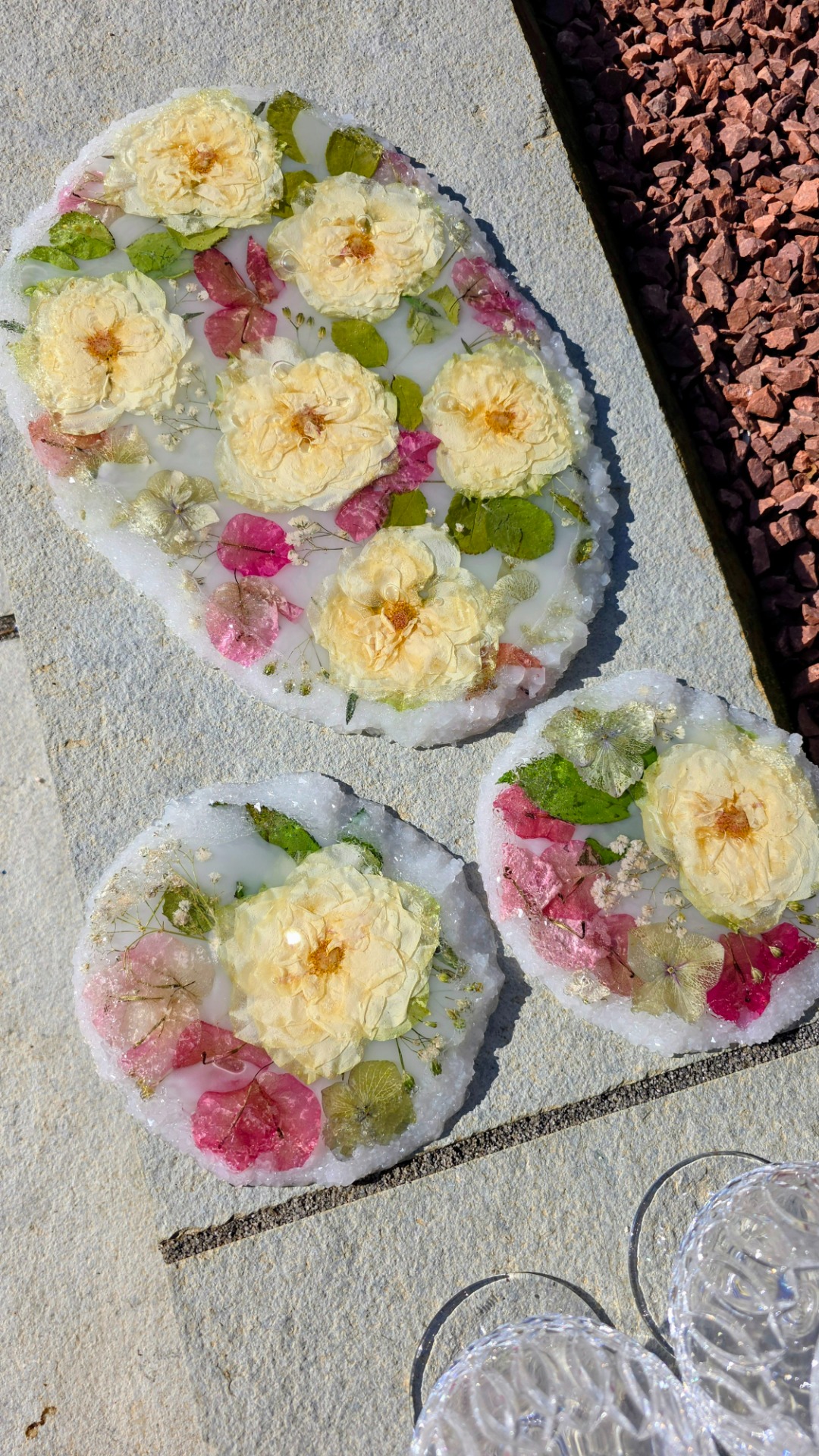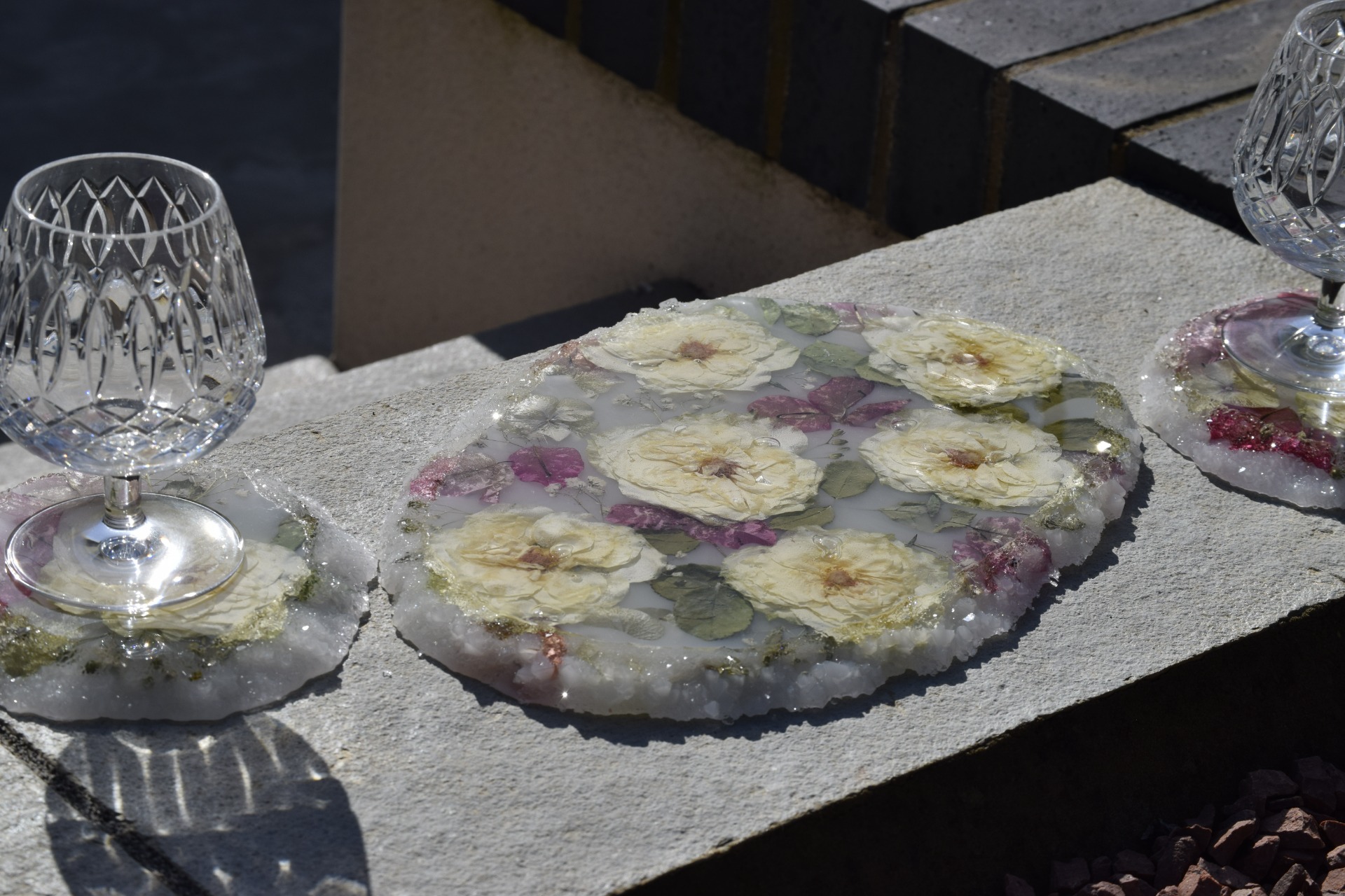 Set of 3, Oval Charcutier Board with a delicate Crystal Edge and Matching Coasters.