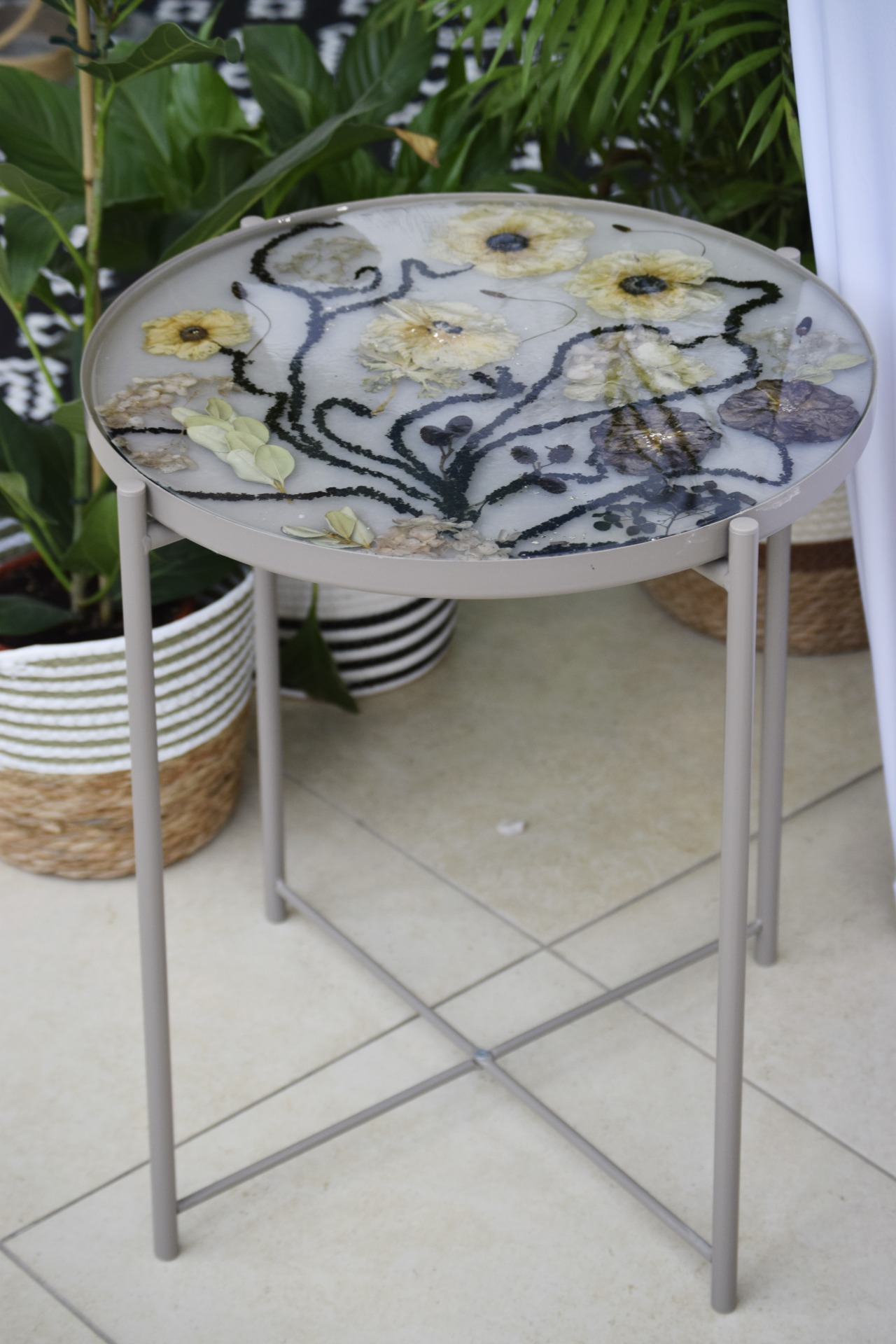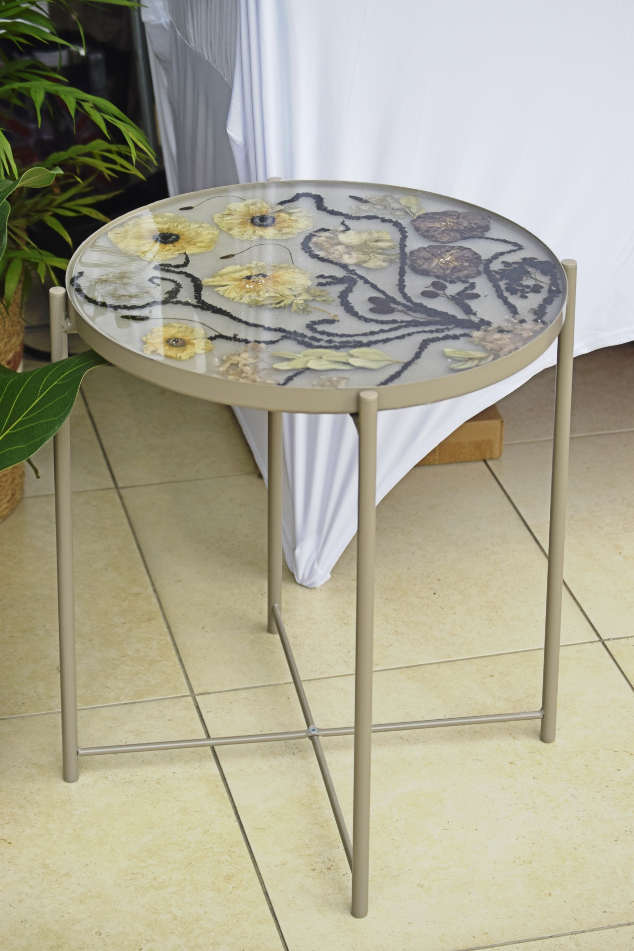 I can transform the removable tray into a bespoke resin artwork filled with your flowers. The table can be purchased by me (check available colours), or if you already have one at home and are thinking of customising it, that's absolutely possible too.
