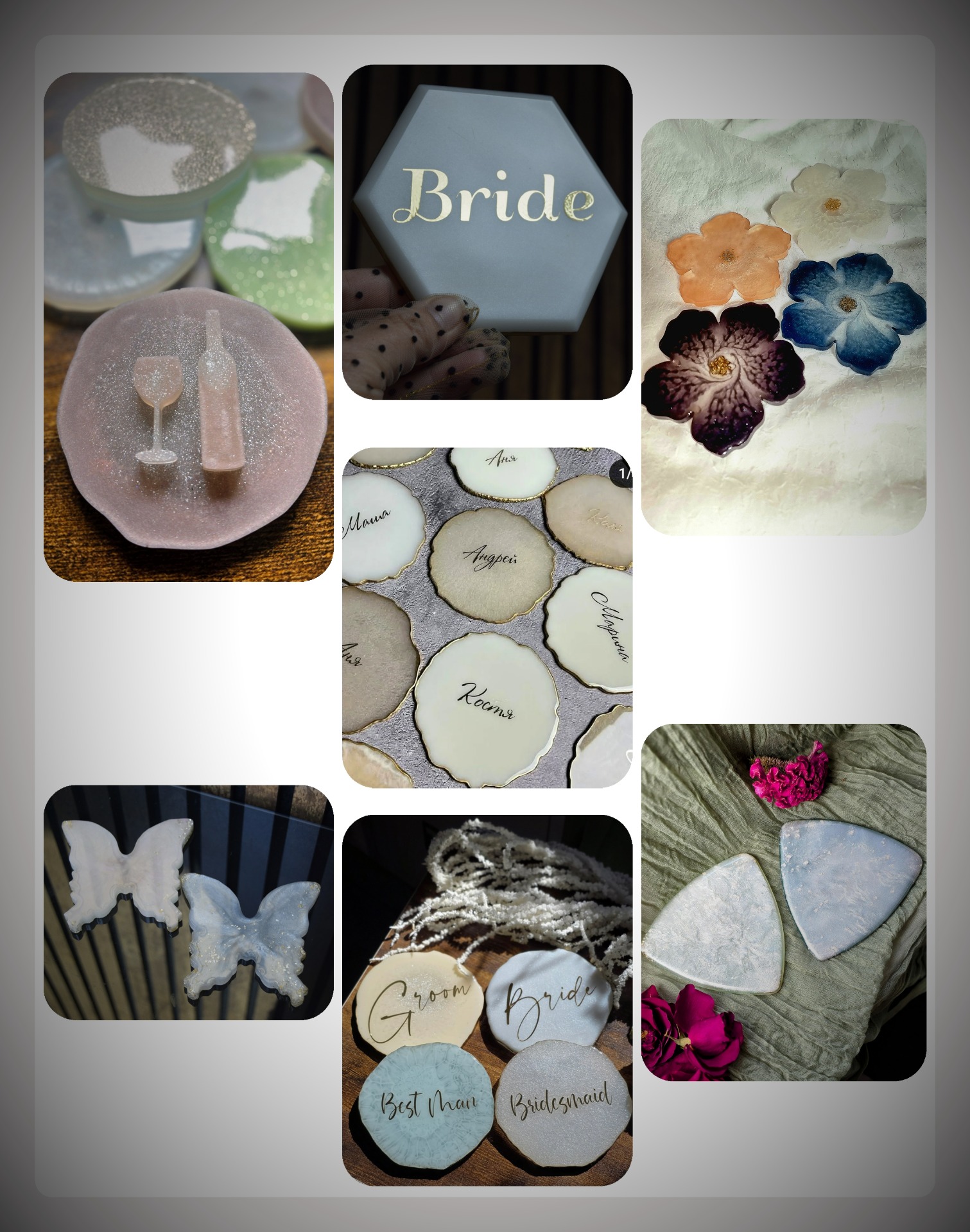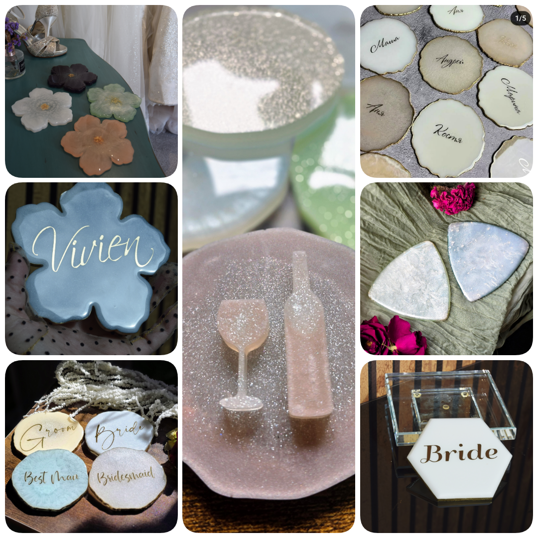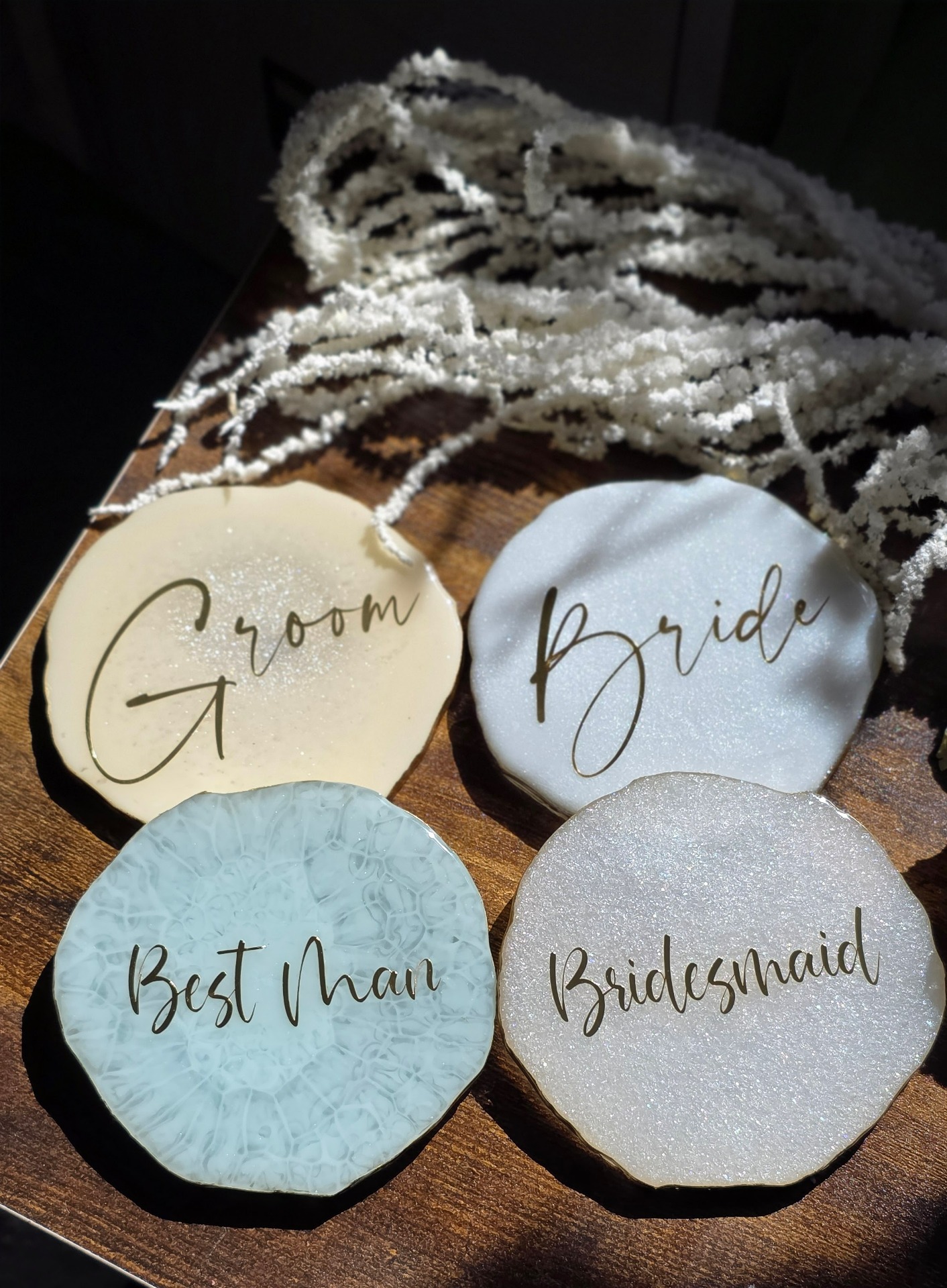 Handcrafted made-to-order high quality epoxy resin coasters with colours of your choice to match your wedding theme.